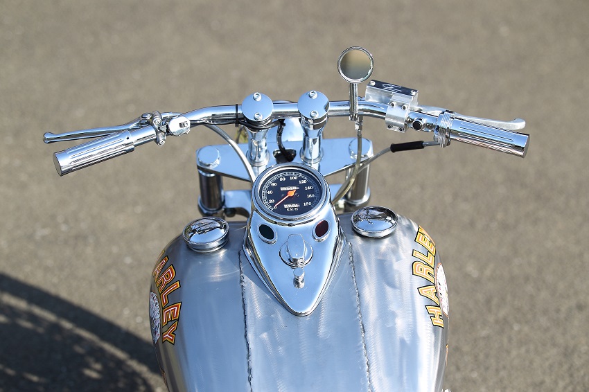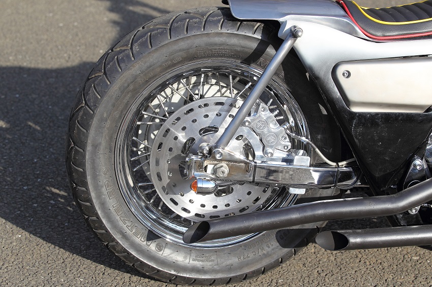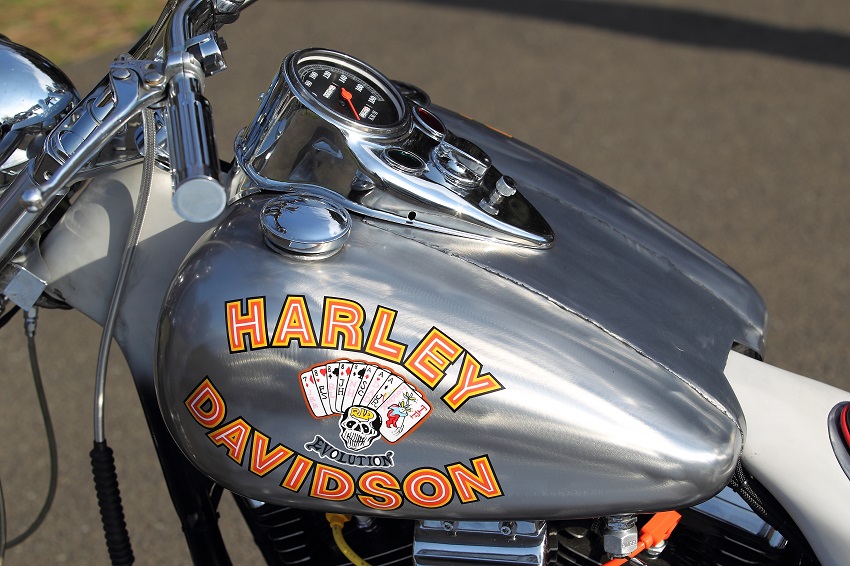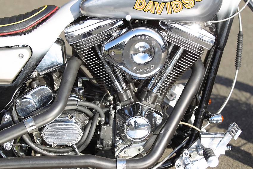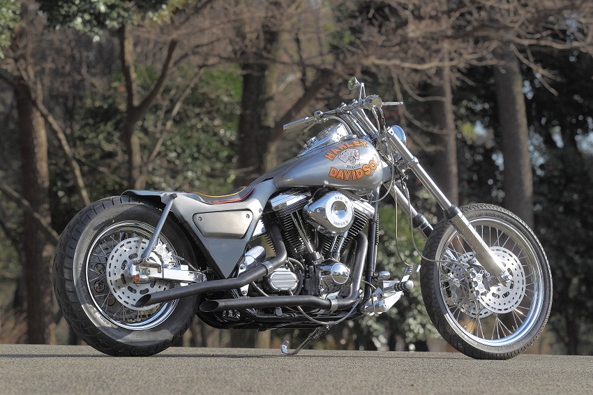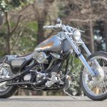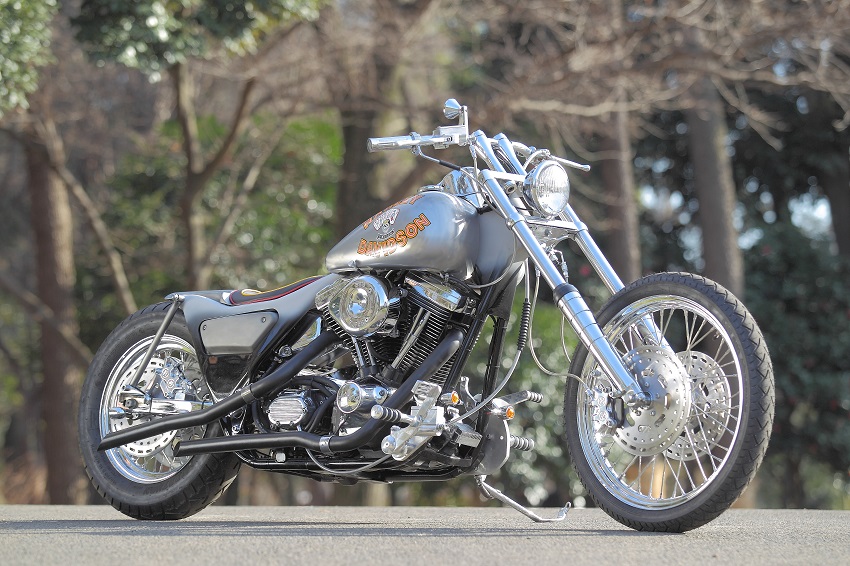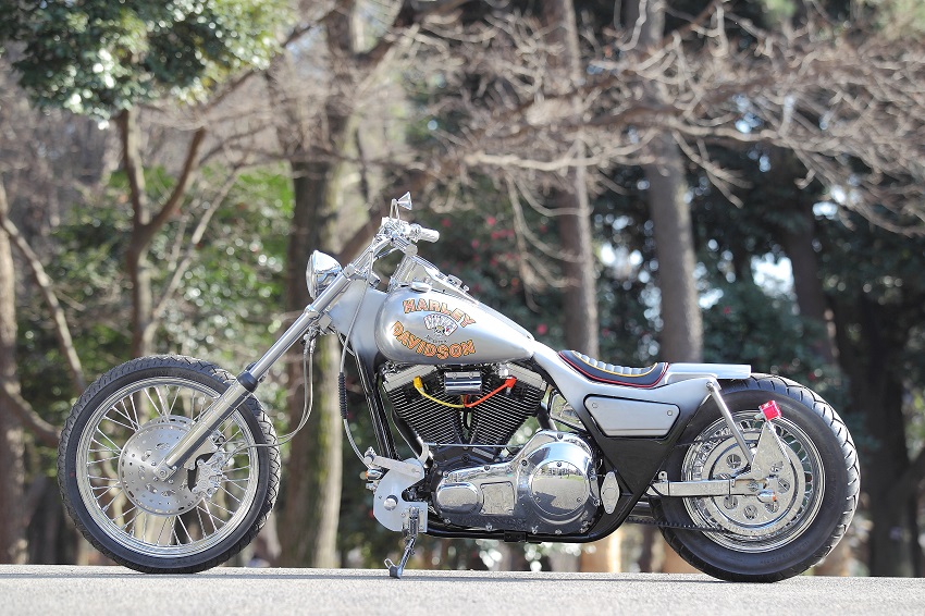 1992年に公開された映画「ハーレーダビッドソン&マルボロマン」の劇中で主演のミッキーロークが走らせていたカスタムバイクのレプリカ。日本ではマルボロマンとよく言われてますが、本当の名前は「BLACKDEATH 3」(ミッキーローク自身が付けた名前)フレームのネック角、フォークの長さ、リジッドバーなど加工製作し今では廃盤となり入手出来ないスクリーミンイーグル製のスロッテッドブレーキローターをワンオフで製作するなどほぼ忠実に再現していおります。